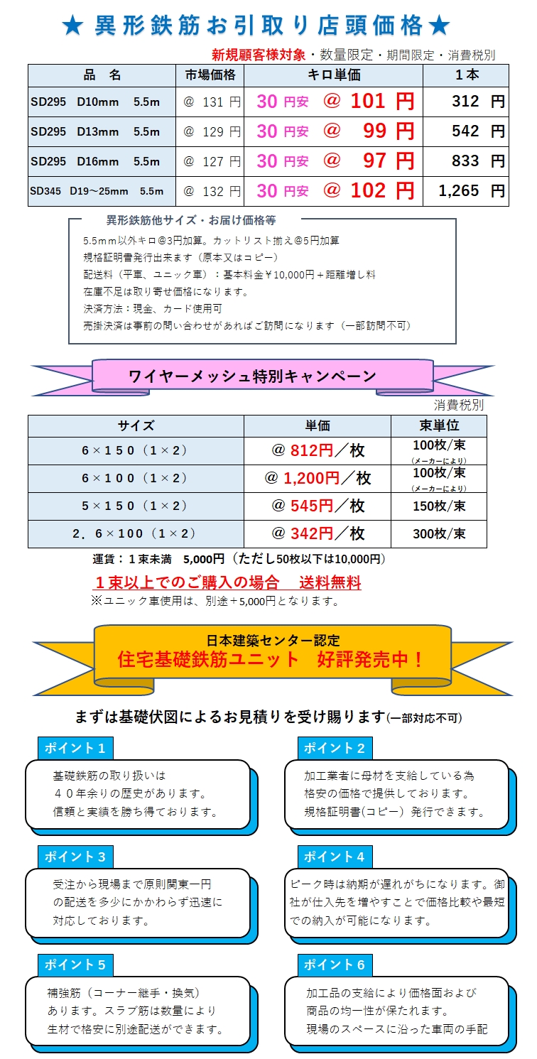 サイズ2X4、 DBメッシュ(D10mm、D13mm)現場配送出来ます。
