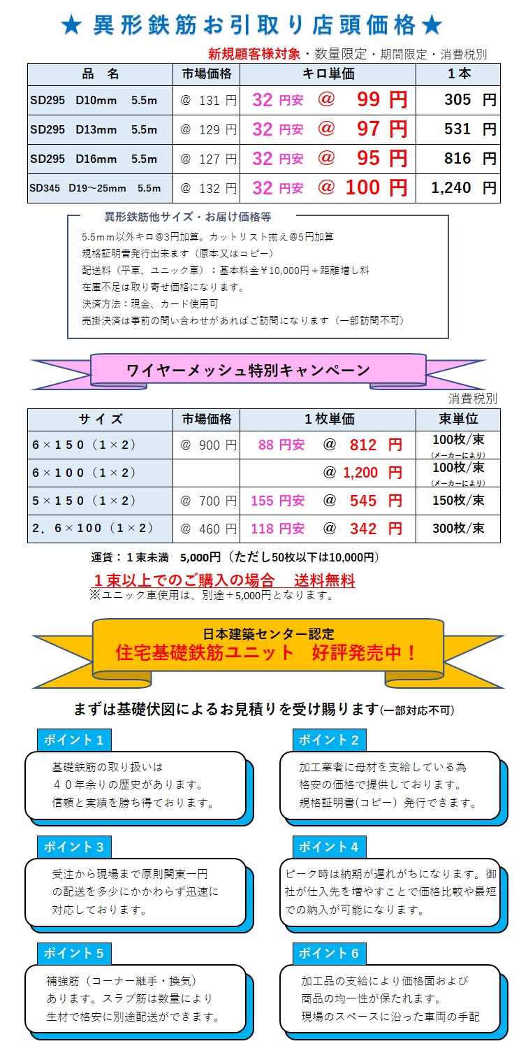 サイズ2X4、 DBメッシュ(D10mm、D13mm)現場配送出来ます。